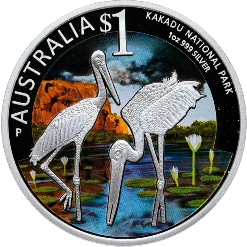 Изображены два черношейных аиста (ябиру) на фоне цветного живописного пейзажа парка с водяными лилиями. Вверху слева вдоль канта надпись: P AUSTRALIA $1 (монограмма Пертского монетного двора, страна-эмитент, номинал). Вверху справа в две строки: KAKADU NATIONAL PARK 1oz 999 SILVER (Национальный парк Какаду, вес и проба серебра).