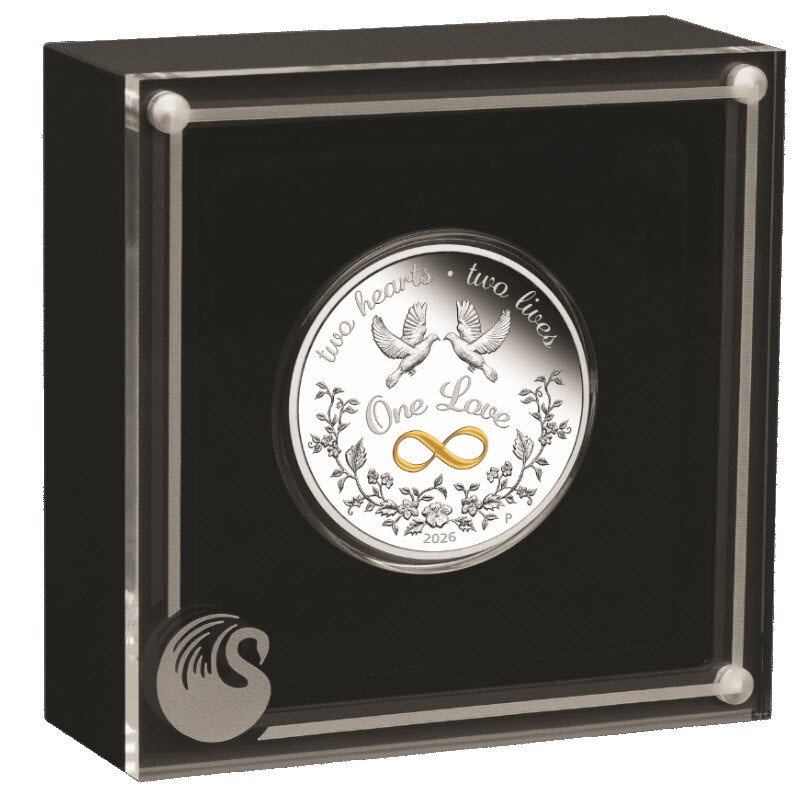 На реверсе изображены два голубя, золотой символ бесконечности и узор из цветов и листьев. В центре надпись: One Love, вдоль канта: two hearts • two lives 2026 (два сердца, две жизни, год чеканки). Выше и правее 5 в 2026 инициалы дизайнера AH (Aleysha Howarth).