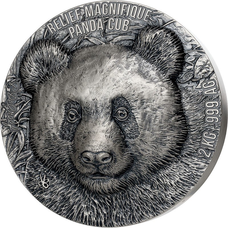 Эта чудесная серебряная монета Бенина весом 2 кг посвящена панде, национальному достоянию Китая. У нее ультравысокий рельеф с античной отделкой работы Бени Дебакера (Beni Debacker) монетного двора П. де Грефа. Поставляется в футляре с сертификатом подлинности. Тираж: 75 штук.