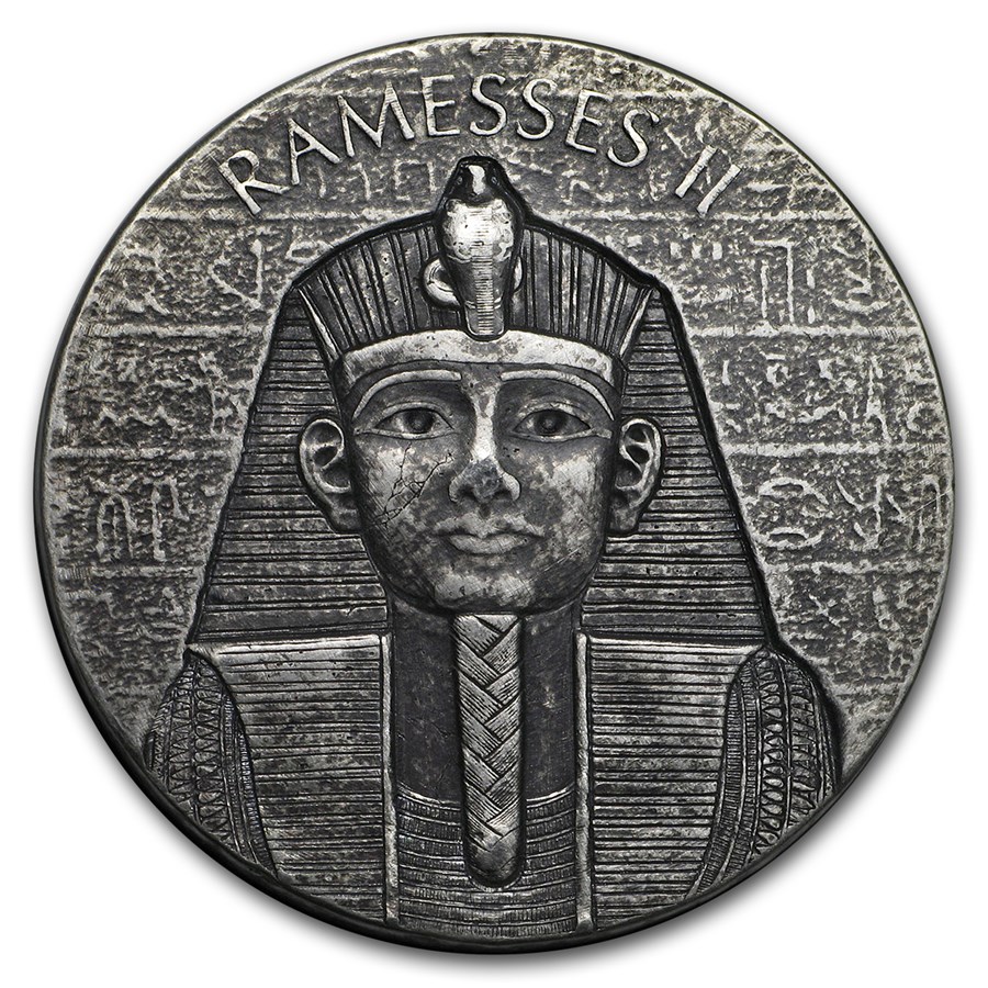 Серебряная монета Чада «Египетские реликвии. Рамзес II» 2016 года выпуска посвящена Рамзесe II, одному из самых значимых правителей Древнего Египта. У монеты великолепный дизайн, подражающий иероглифическим изображениям Древнего Египта. Это монета принадлежит серии «Египетские реликвии».