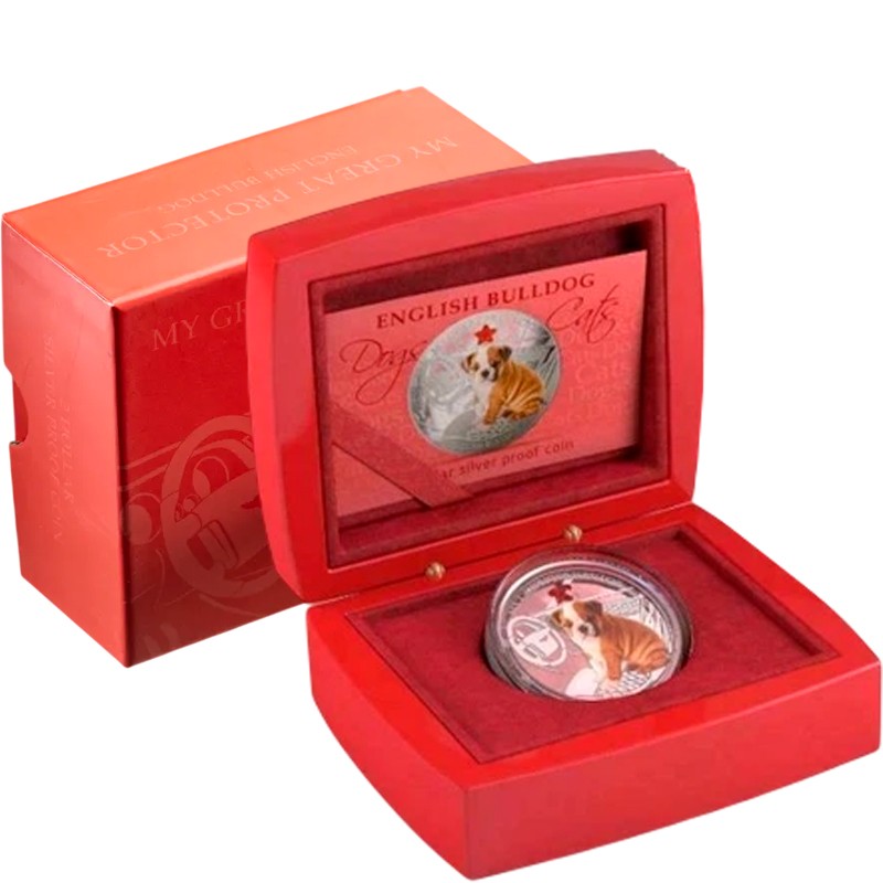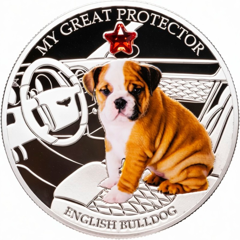 Эта чудесная серебряная монета весом 1 унция из серии «Собаки и кошки» (Dogs&Cats) посвящена собаке породы Английский бульдог.