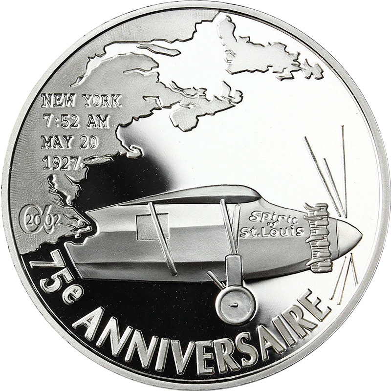 Эта чудесная серебряная монета Парижского монетного двора Франции посвящена 75-летию первого беспосадочного трансатлантического перелета, совершенного Чарльзом Линдбергом в 1927 году.