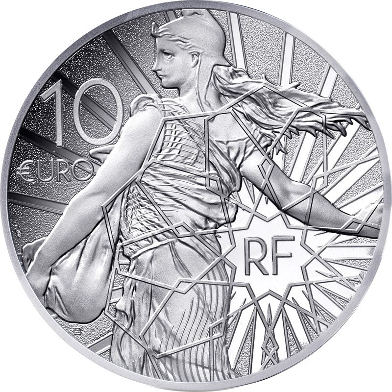 На аверсе изображена модернизированная версия Сеятельницы работы Луи-Оскара Роти (Louis-Oscar Roty), на драпировке её одеяния изображен геральдический вариант французского флага. Слева надпись: 10 €URO (номинал), справа: RF (страна-эмитент) окружена переплетающимися шестиугольниками.