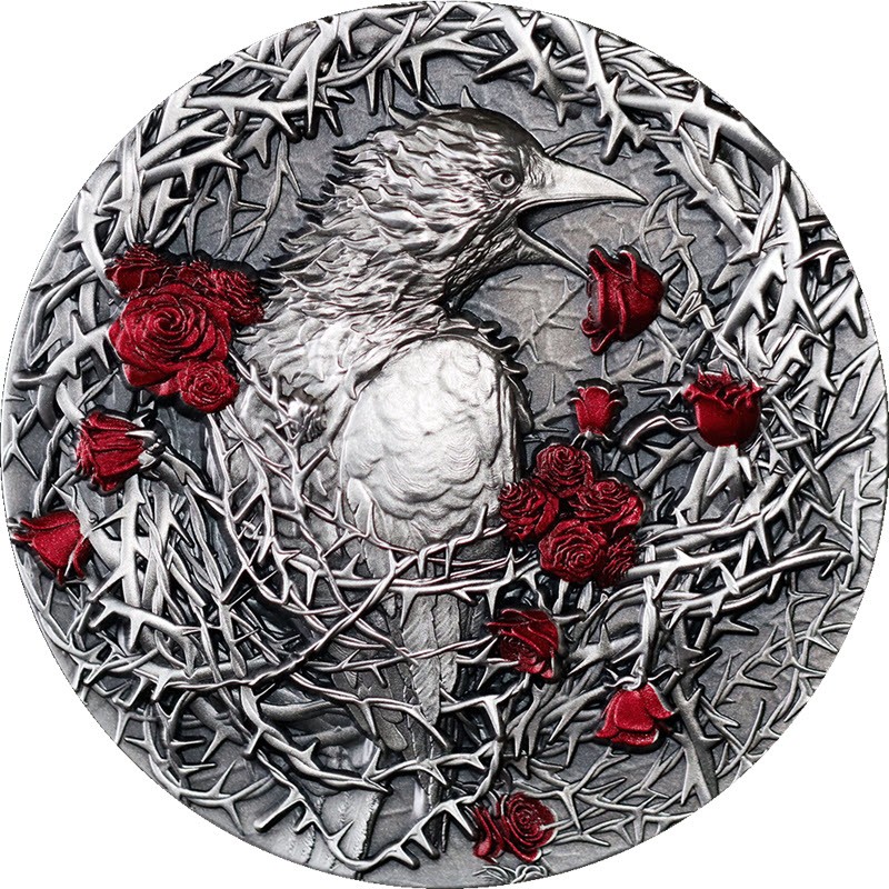 Эта чудесная серебряная монета весом в 3 унции посвящена Большой Терновой Птице - символ стойкости и триумфа перед лицом невзгод. Монета служит одой преодолению препятствий, призывая людей мужественно преодолевать трудности. Это эмоциональный пробный камень, призывающий вас преодолевать трудности каждого дня стойко и мужественно. Каждая встреченная колючка становится нотой в симфонии вашего путешествия, а каждое преодоленное препятствие — крещендо триумфа. Красный цветок - устойчивое цветение среди хаоса. Красный цветок олицетворяет неукротимый дух внутри каждого из нас, который преодолевает трудности, процветает вопреки всему и излучает яркий свет даже в самые мрачные моменты. Монета имеет античную отделку, шикарный дизайн и выборочную окраску. Поставляется в футляре с сертификатом подлинности. Тираж: 333 штуки.