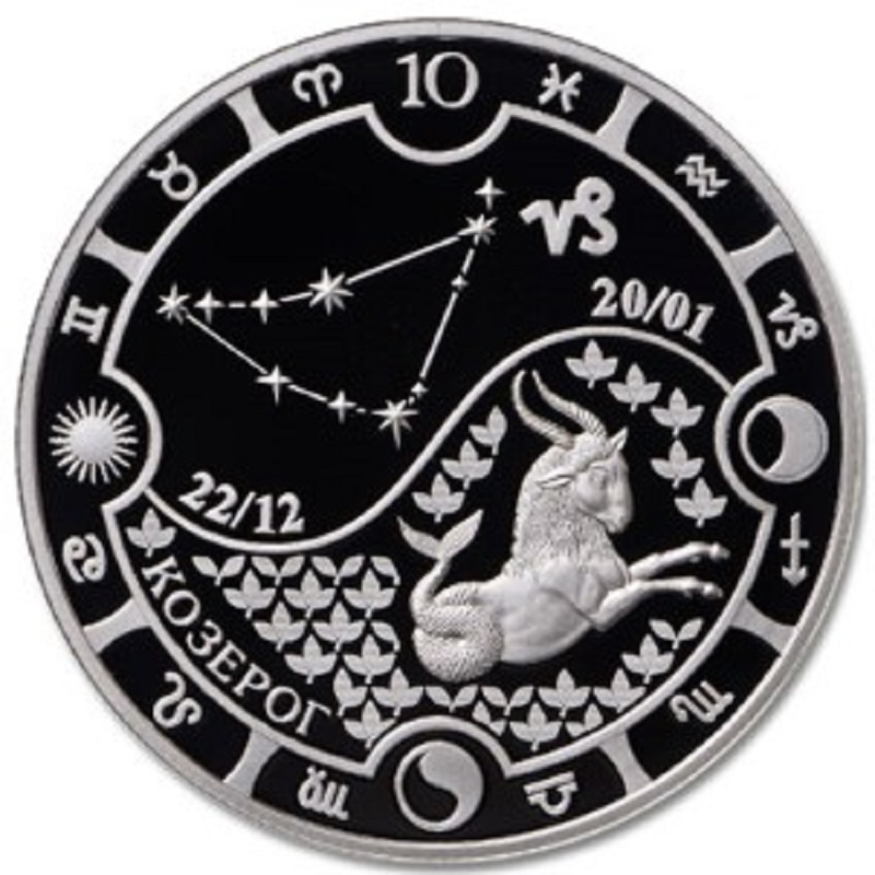 На зеркальном поле вдоль канта расположены 12 зодиакальных символов, цифра «10» и символы солнца, луны и Инь и Янь. Центральная часть изображения представляет собой так же символ Инь и Янь. Верхняя часть его имеет зеркальное поле, в котором расположено схематичное изображение созвездия Козерога, даты «22/12» и «20/01». В нижней части на зеркальном поле расположено схематичное повторяющееся изображение трилистника, символизирующее стихию Козерога - землю, зодиакальный символ знака Козерог, надпись «КОЗЕРОГ». В центре стилизованное изображение Козерога.