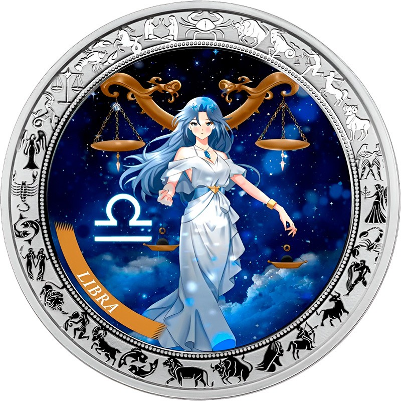 Эта красивая серебряная монета из серии “Аниме Зодиак“ посвящена седьмому астрологическому знаку зодиака - “Весы” (Libra). Считается, что к нему принадлежат рождённые с 23 сентября по 22 октября. Отличительной чертой представителей этого знака является стремление к гармонии во всём. Весы – утонченные натуры и прирожденные дипломаты, обладающие стойкостью духа и несгибаемой волей к победе в любом соперничестве.