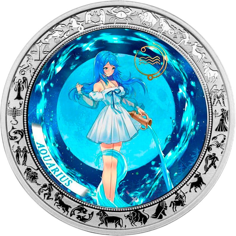 Эта красивая серебряная монета из серии “Аниме Зодиак“ посвящена одиннадцатому астрологическому знаку зодиака - “Водолей” (Aquarius). Считается, что к нему принадлежат рождённые с 21 января по 18 февраля. Водолеи наделены творческой энергией, оптимизмом и развитой интуицией. Не выносят рутины и скучных обязанностей. Независимость — главное условие их деятельности.