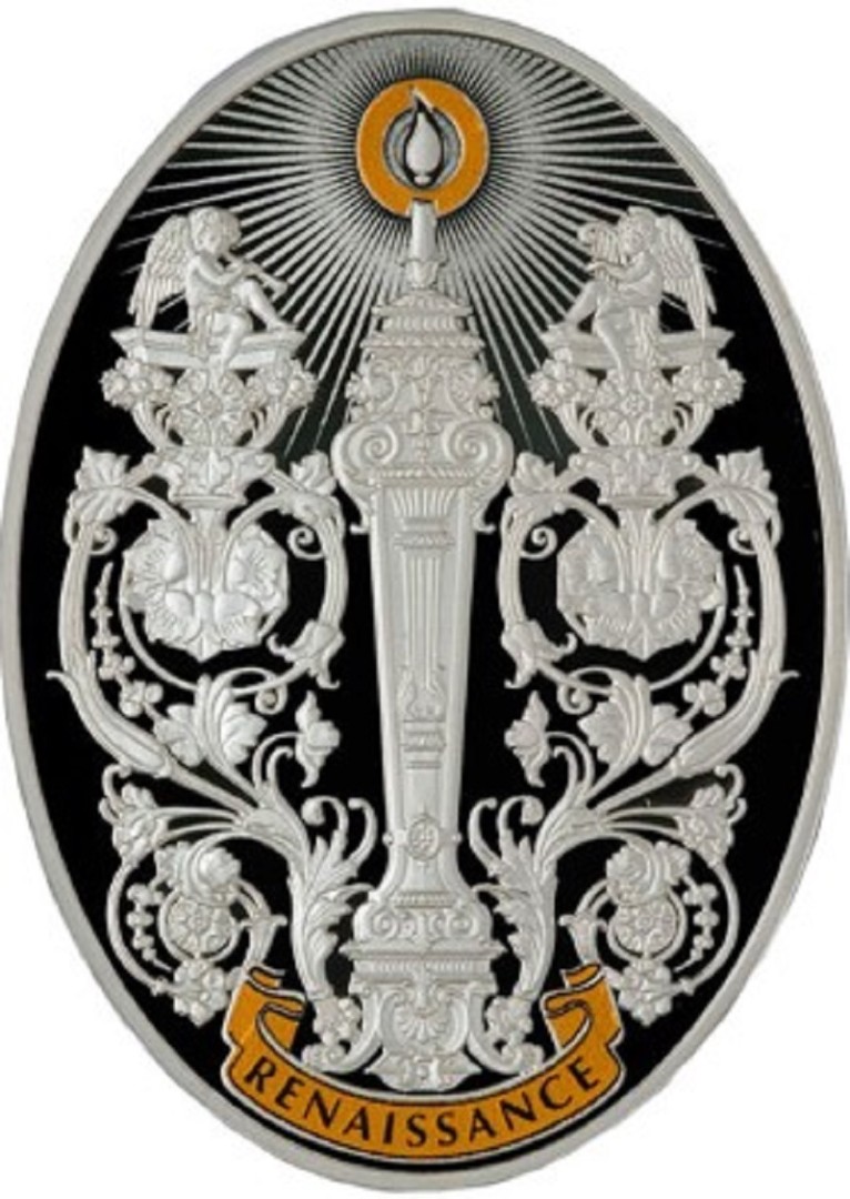 Монета посвящена всемирно известному стилю Ренессанс. Ренессанс – эпоха Возрождения, одна из великих культурных эпох, знаменующая возвращение к культурному наследию классической Древности. Дизайн построен в присущей эпохе Возрождения симметрии, геометрии и пропорции. Характерные черты построения композиции монеты – это лиственный орнамент, лепные украшения, геометрические формы, строгая композиция, разнообразие декоративных элементов.