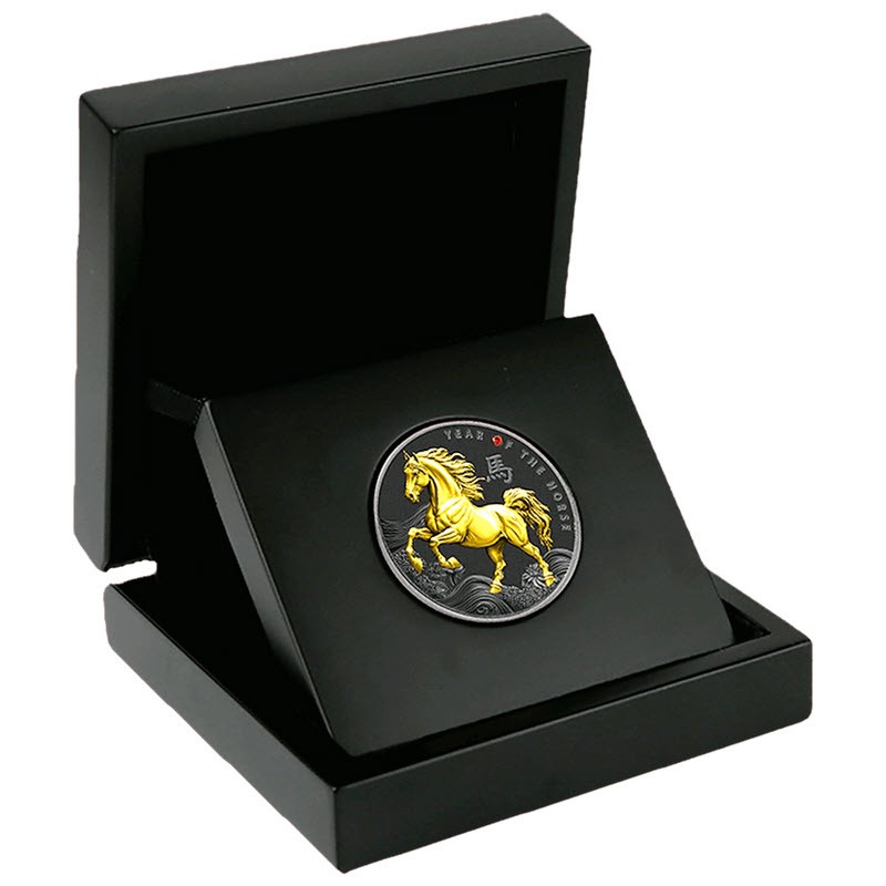 На реверсе изображена позолоченная лошадь. Над лошадью китайский иероглиф: 馬 (Лошадь). Вверху надпись с вставкой красного кристалла: YEAR OF THE HORSE.