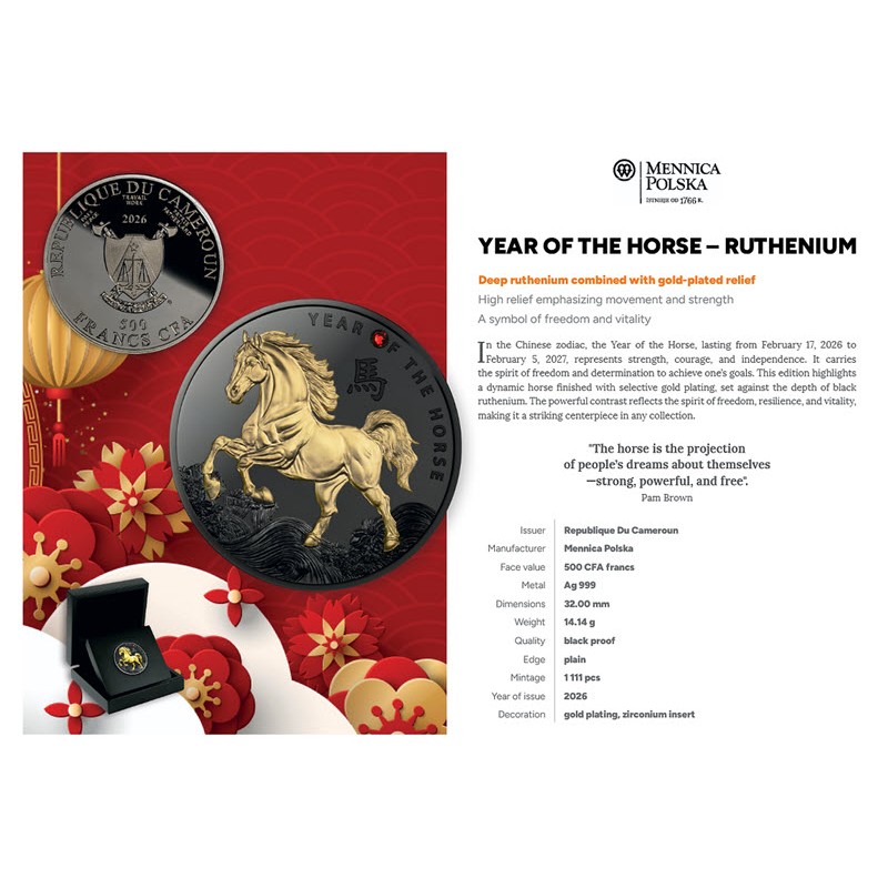 Серебряная монета от польского монетного двора Mint of Poland посвящена символу 2026 года - Лошади. У нее качество пруф, дизайн с выборочным золочением, рутениевым покрытием и вставка красного кристалла. Поставляется в оригинальном футляре с сертификатом подлинности. Тираж: 1111 штук.