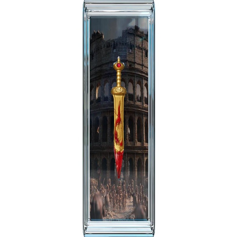 Эта прекрасная серебряная монета весом в 2 унции – вторая из серии «Легендарное оружие» - посвящена мечу гладиусу. У нее размеры 160 Х 20 мм, качество античной отделки, выборочное золочение и селективное УФ-свечение. Поставляется в футляре в акриловом блоке с сертификатом подлинности. Тираж: 498 штук.