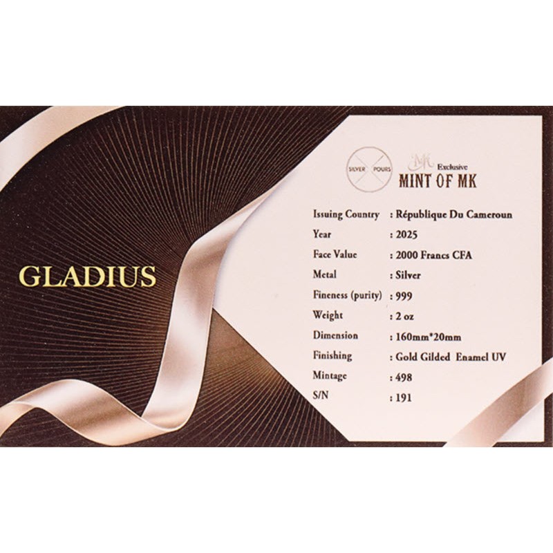 На аверсе в основании лезвия изображен герб Камеруна. Вокруг герба надпись: REPUBLIQUE DU CAMEROUN 2 oz Ag 999 2000 FRANCS CFA 2025 (страна-эмитент, вес и проба серебра, номинал, год чеканки). Слева вдоль кромки: Gladius Sword of Gladiator (Гладиус – меч Гладиаторов).