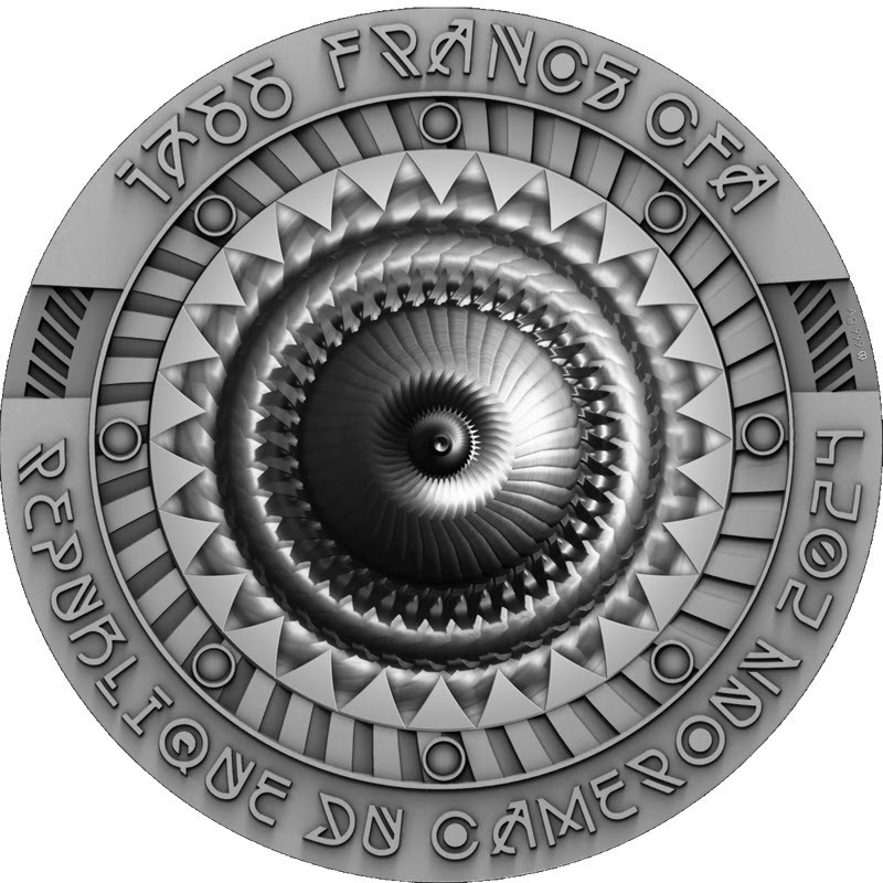 На аверсе изображена летающая тарелка с межзвездным дизайном. Вдоль канта надпись космическим шрифтом: 1766 FRANCS CFA REPUBLIQUE DU CAMEROUN 2024 (номинал, страна-эмитент, год чеканки).