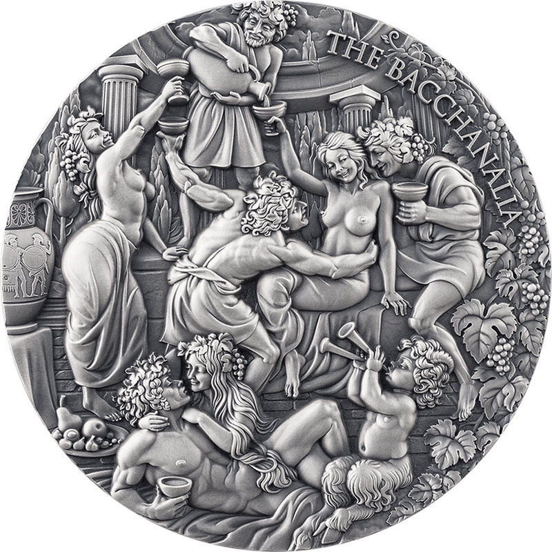 На реверсе интерпретация гравюры Гюстава Доре «Вакханалия». Вверху надпись: THE BACCHANALIA.