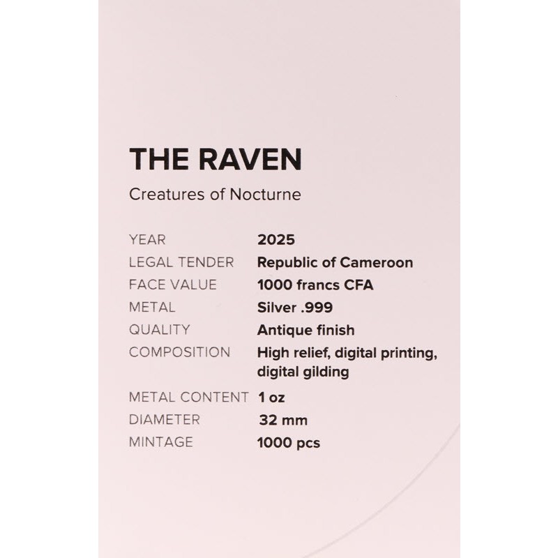 Серебряная монета Камеруна "Ночные существа. Ворон" 2025 г.в., 31.1 г чистого серебра (проба 999)