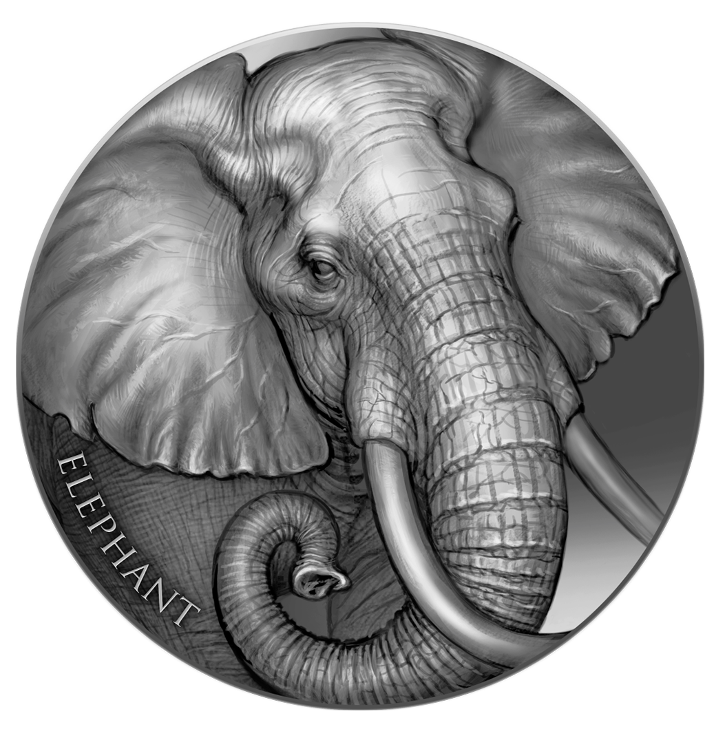 а реверсе монеты расположено очень подробное изображение слона в высоком рельефе. На реверсе также имеется надпись: «ELEPHANT» – название монеты.