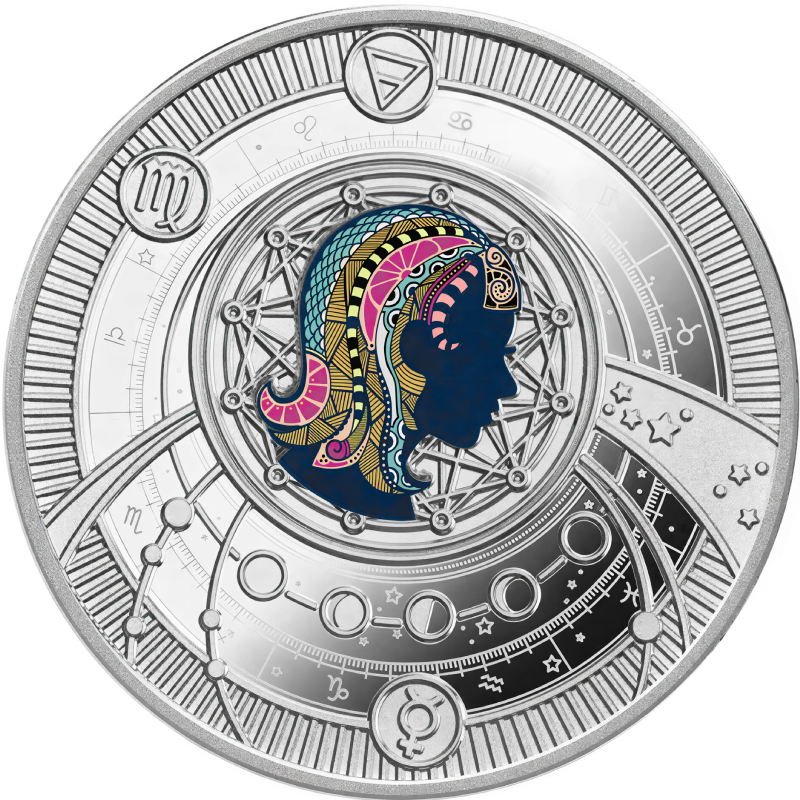 В центре монеты находится цветное изображение женщины с длинными волосами, выполненное в виде мандалы. Вокруг расположены астрологические символы: тригон Земли, планета Меркурий, знак Девы.