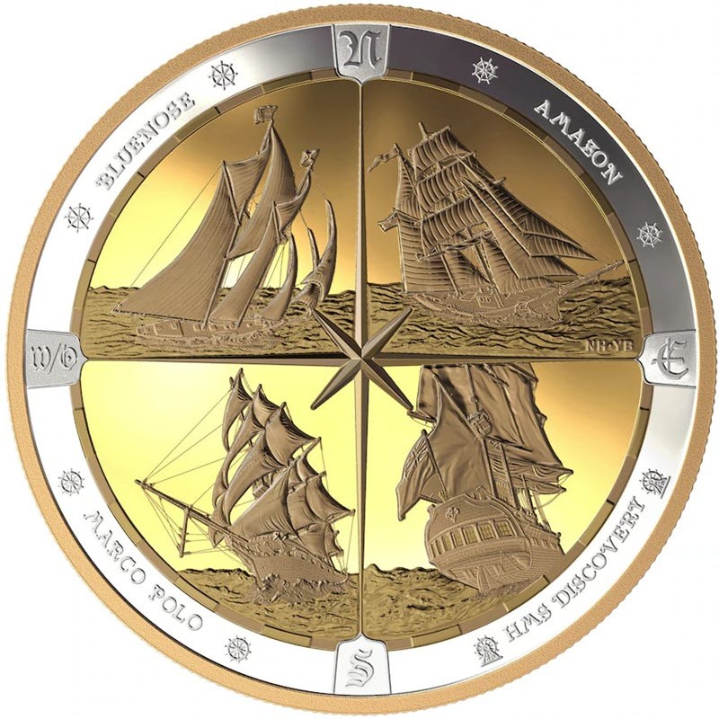На реверсе в форме компаса изображены легендарные корабли: AMAZON, BLUENOSE, HMS DISCOVERY, MARCO POLO. Справа у канта инициалы дизайнеров: NH · YB (Neil Hamelin, Yves Bérubé).