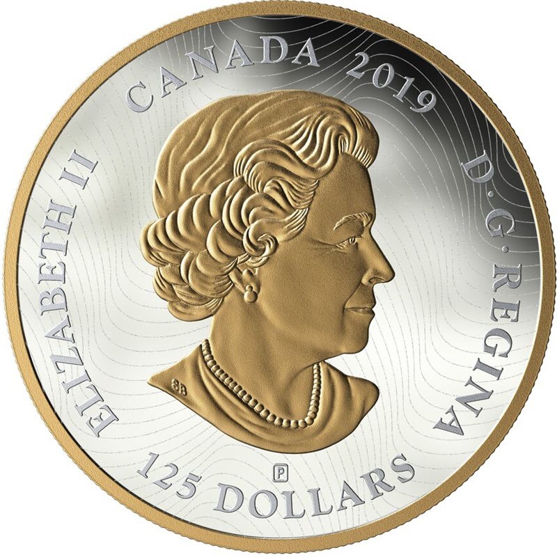На аверсе изображена Ее Величество королева Елизавета II. На левом плече королевы инициалы дизайнера SB (Susanna Blunt). Вдоль канта надпись: ELIZABETH II CANADA 2019 D·G·REGINA 125 DOLLARS (Елизавета II, Милостью Божьей, Королева, страна-эмитент, год чеканки, номинал). Под портретом символ Р (выборочное золочение).