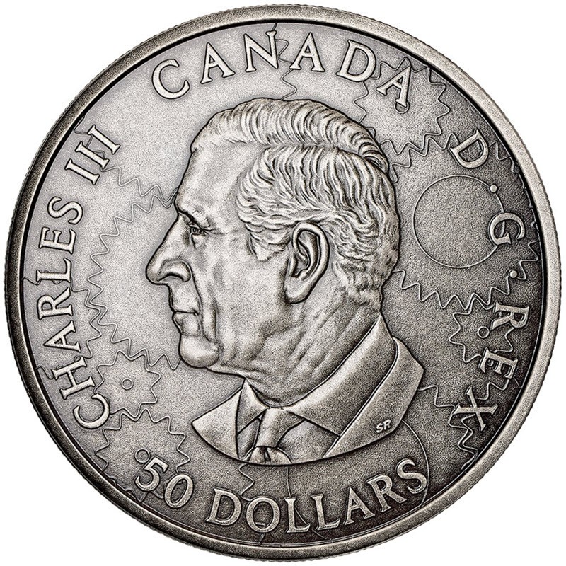 На аверсе изображен Его величество Король Чарльз III на фоне шестеренок. На усечении шеи инициалы дизайнера SR (Steven Rosati). Вдоль канта надпись: CHARLES III D·G·REX 50 DOLLARS (Чарльз III, милостью Божией, король, номинал).