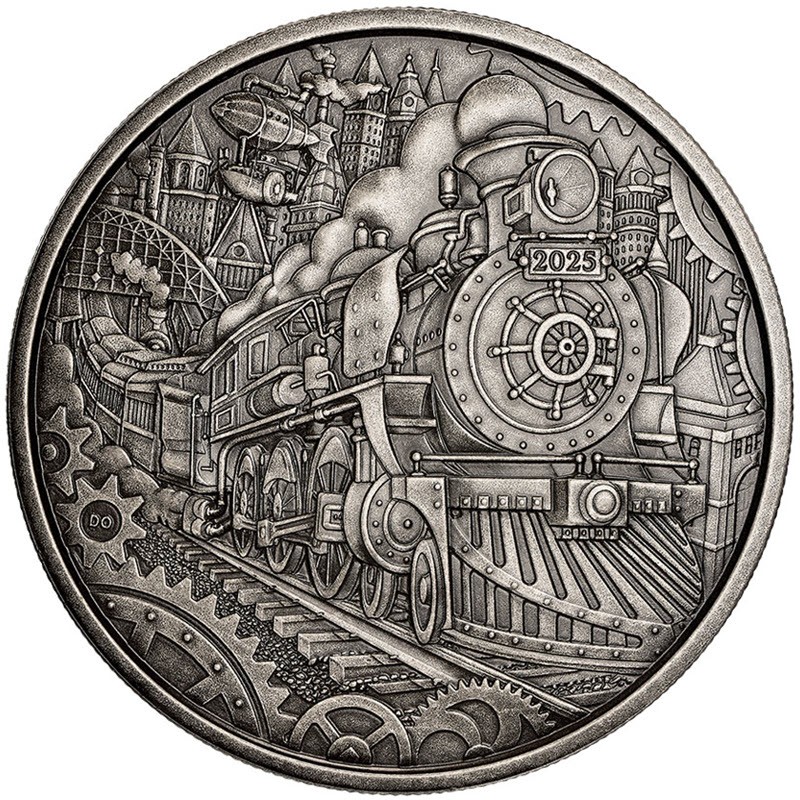 На реверсе изображен мчащийся паровоз на фоне футуристического города. На паровозе надпись: 2025 (год чеканки). Слева у канта внутри шестеренки инициалы дизайнера: DO (David Oram).