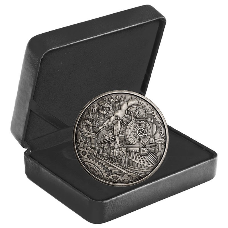 Эта чудесная серебряная монета от Канадского монетного двора в стиле стимпанк посвящена паровозу. У нее качество античной отделки. Поставляется в оригинальном футляре с сертификатом подлинности.