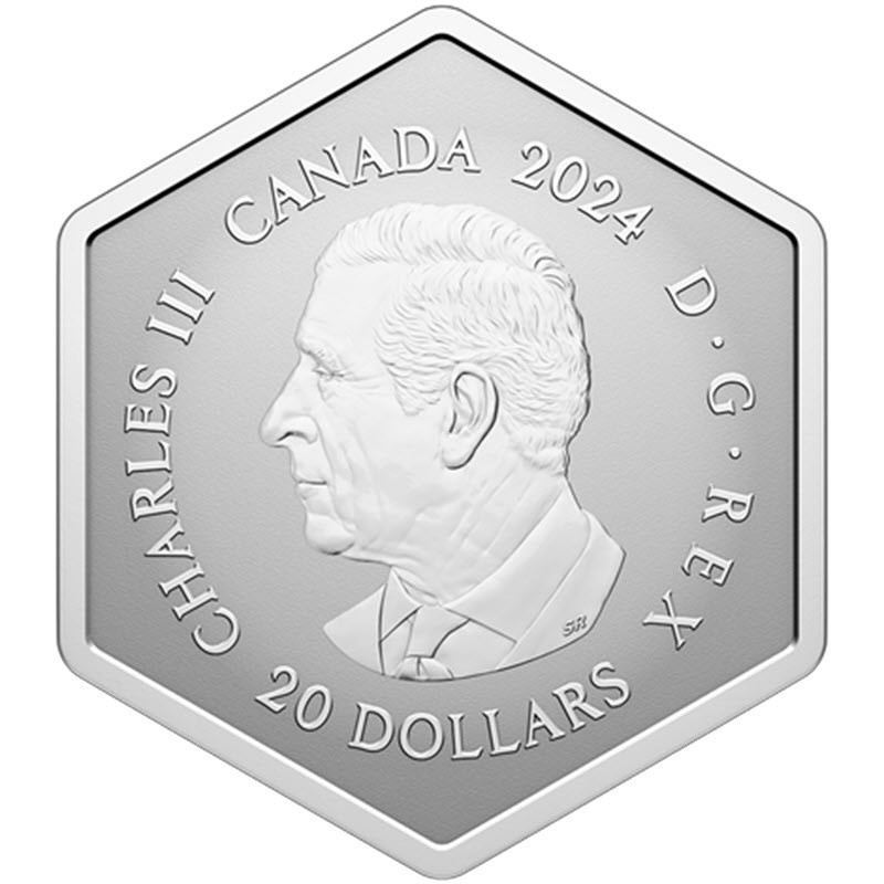 На аверсе изображен Его величество Король Чарльз III. На воротнике инициалы дизайнера SR (Steven Rosati). Вдоль канта надпись: CHARLES III CANADA 2024 D·G·REX 20 DOLLARS (Чарльз III, страна-эмитент, год чеканки, милостью Божией, король, номинал).