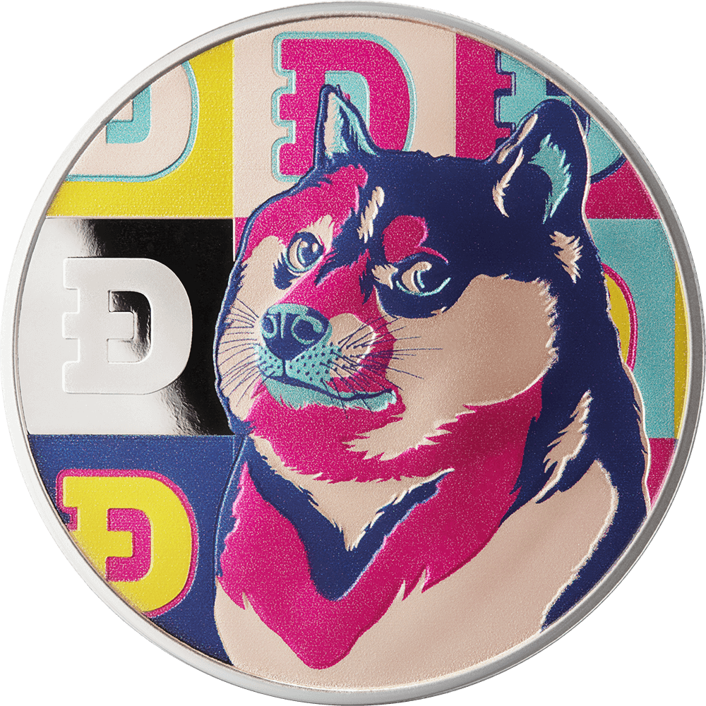Эта серебряная монета весом в 1 унцию является вторым выпуском серии UCS и включает монету DogeCoin с художественным изображением логотипа известной мем-монеты. Монета качества Proof, красивого цвета и имеет голографическую поверхность. Он поставляется в элегантном футляре вместе с сертификатом подлинности.