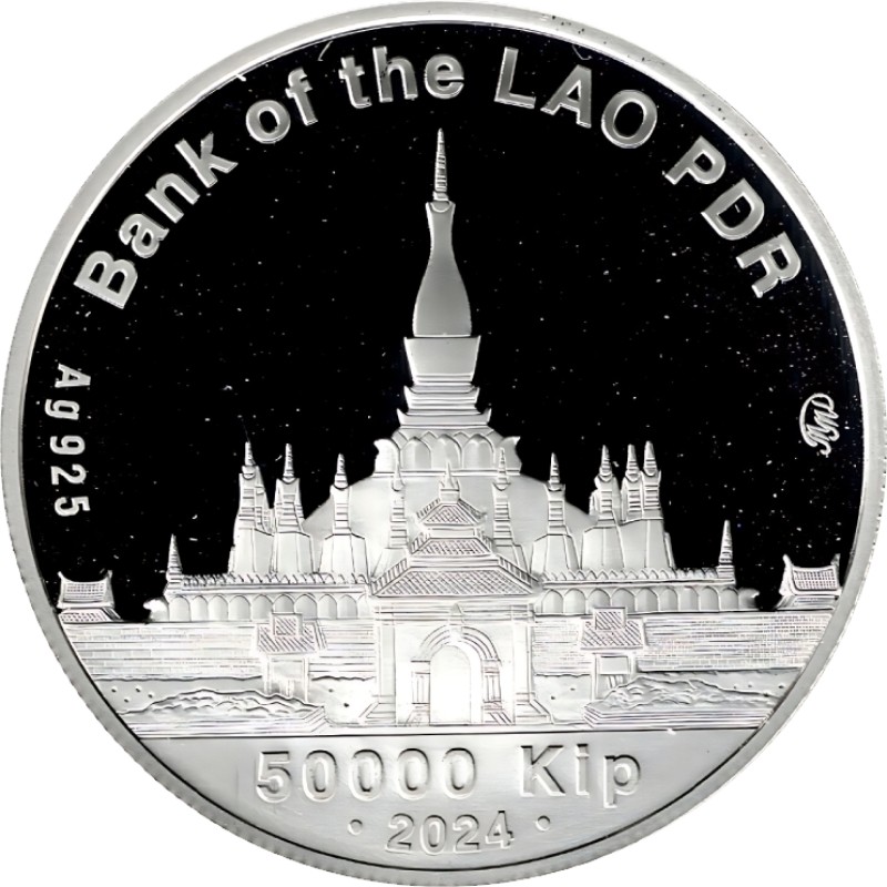 На аверсе монеты изображено главное здание храмового комплекса Пха Тхат Луанг в Вьентьяне. Вверху вдоль канта надписи: Bank of the LAO PDR Ag 925 ММД (Банк Лаоса, проба серебра, монограмма Московского монетного двора). Внизу вдоль канта: 50000 Kip ∙ 2024 ∙ (номинал и год чеканки).