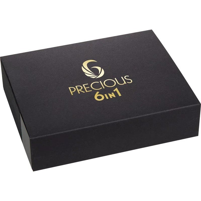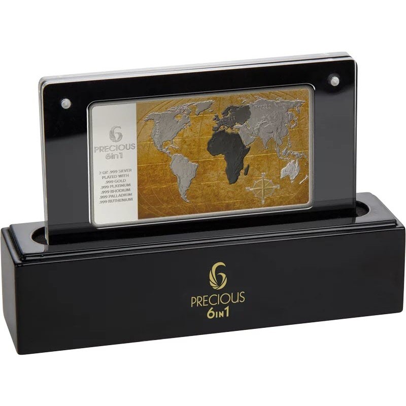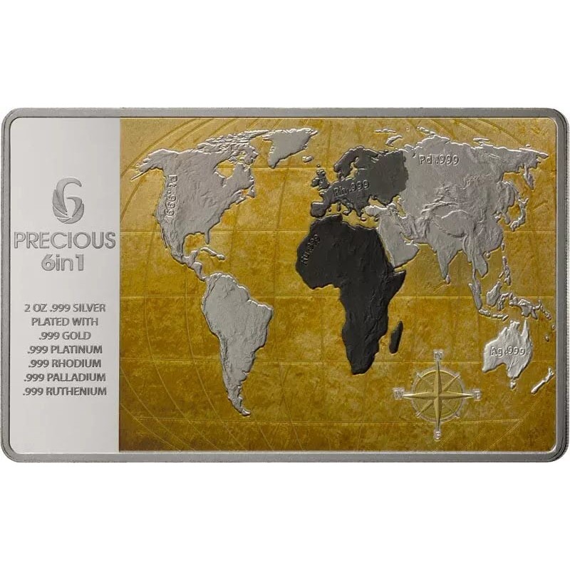 Слева надпись в 10 строк: 6 PRECIOUS 6 in 1 2 OZ .999 SILVER PLATED WITH .999 GOLD .999 PLATINUM .999 RHODIUM .999 PALLADIUM .999 RUTHENIUM (6 драгоценных металлов, 6 в 1, вес и проба серебра, покрытие золотом платиной родием палладием рутением).