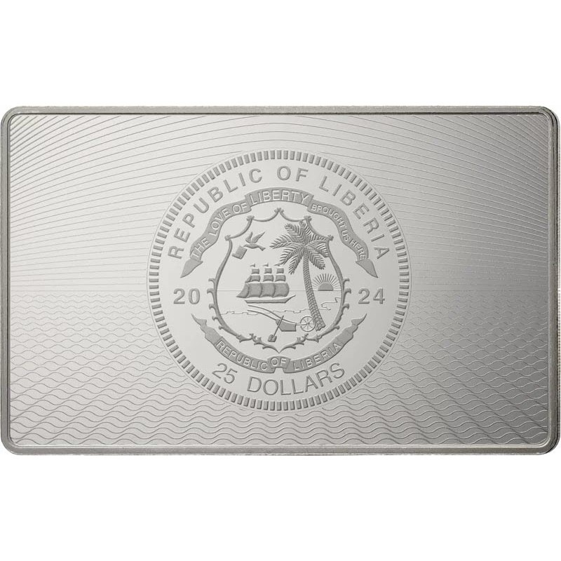На аверсе изображен герб Либерии. На лентах вверху: THE LOVE OF LIBERTY BROUGHT US HERE (Любовь к свободе привела нас сюда), внизу REPUBLIC OF LIBERIA (Республика Либерия). Над гербом надпись: REPUBLIC OF LIBERIA (страна-эмитент), герб разделяет: 2024 (год чеканки), внизу: 25 DOLLARS (номинал).