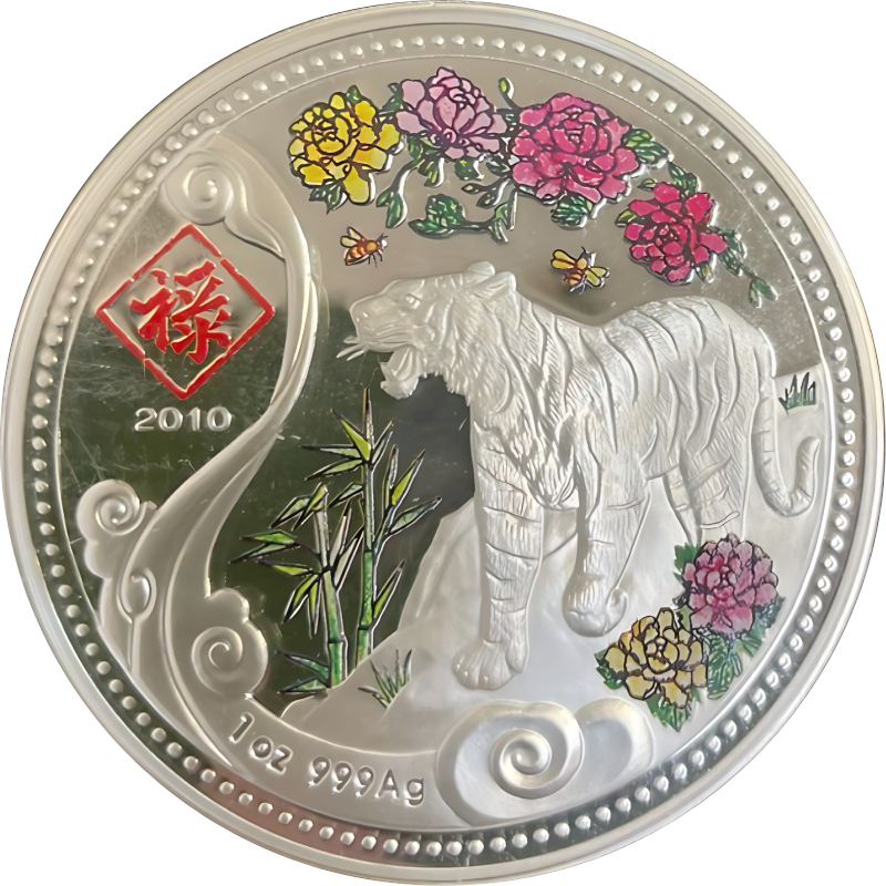 Изображение тигра, стоящего на каменистом склоне в окружении бамбука и разноцветных пионов. Слева - китайский иероглиф 禄 - богатство, ниже – 2010 – год чеканки. Внизу - 1oz 999 Ag – вес и проба серебра.
