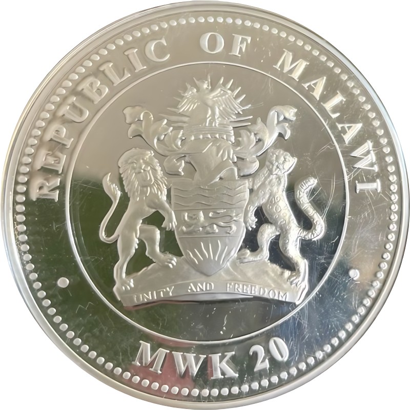 На аверсе изображен государственный герб Республики Малави: геральдический щит поддерживают лев (слева) и леопард (справа), стоящие на холме. Внизу надпись: UNITY AND FREEDOM (Единство и Свобода). Над щитом – орлан на фоне восходящего солнца. Вверху вдоль канта - REPUBLIC OF MALAWI (страна эмитент), внизу - MWK 20 (номинал).