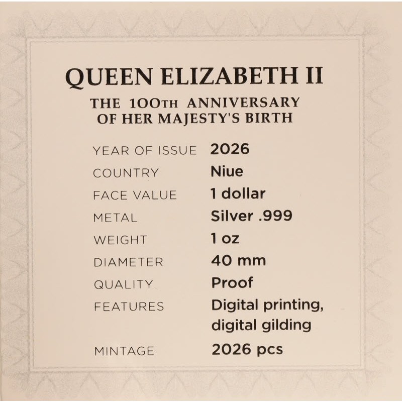 Серебряная монета Ниуэ "100-летие со дня рождения королевы Елизаветы II" 2026 г. (пруф), 31.1 г чистого серебра (проба 999)