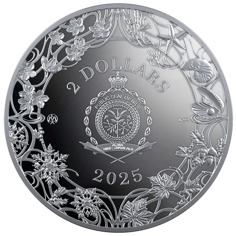 На аверсе в окружении венка ветвей и лоз изображена неофициальная «Государственная печать Ниуэ». Это  композиция из растений в центре внутри двойного декоративного круга, окруженного морскими раковинами. Он увенчан короной Святого Эдуарда (символом Соединенного Королевства, монарх которого в конечном итоге является главой государства Ниуэ). Сверху между ними надпись PUBLIC SEAL OF NIUE. Ниже на ленте в две строки изображен девиз ATUA NIUE TUKULAGI, ниже которых две перекрещенные катуа. Вокруг герба надпись: LM 2 DOLLARS Ag 999 2025  (монограмма Литовского монетного двора, номинал, проба серебра, год чеканки).