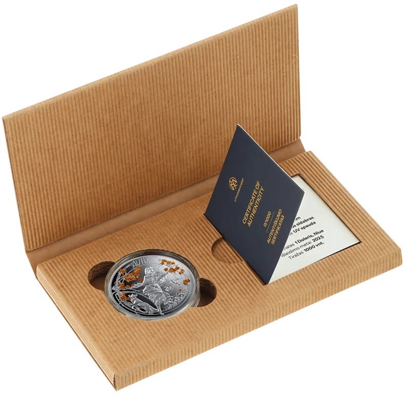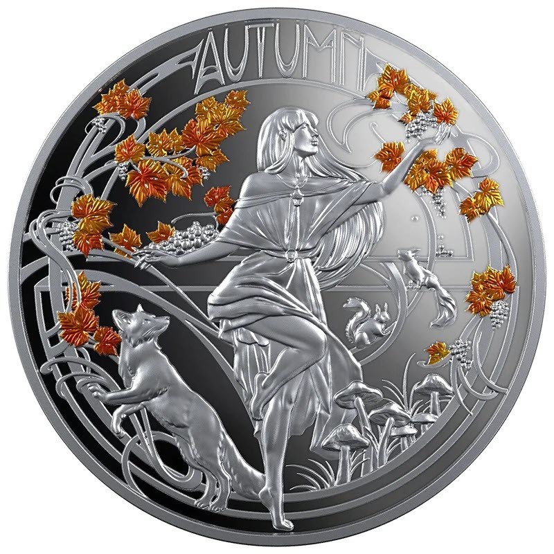 Эта чудесная серебряная монета от Литовского монетного двора – вторая из серии «Четыре времени года» - посвящена осени. Дизайнер Lucrezia Delfini. У нее качество пруф и селективная окраска. Поставляется в футляре с сертификатом подлинности. Тираж: 1000 штук.