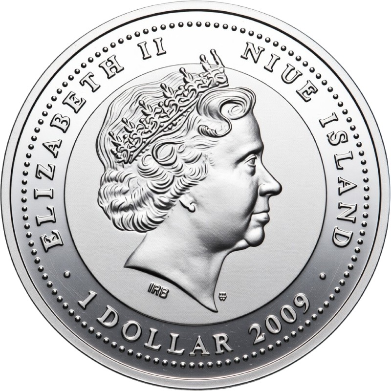 В центре - портрет Ее Величества Королевы Елизаветы II работы дизайнера Яна Рэнка-Бродли. Справа m/w - монограмма Польского монетного двора. Вдоль канта надписи: ELIZABETH II NIUE ISLAND ∙ 1 DOLLAR 2009 ∙ (Елизавета II, страна-эмитент, номинал, год чеканки).