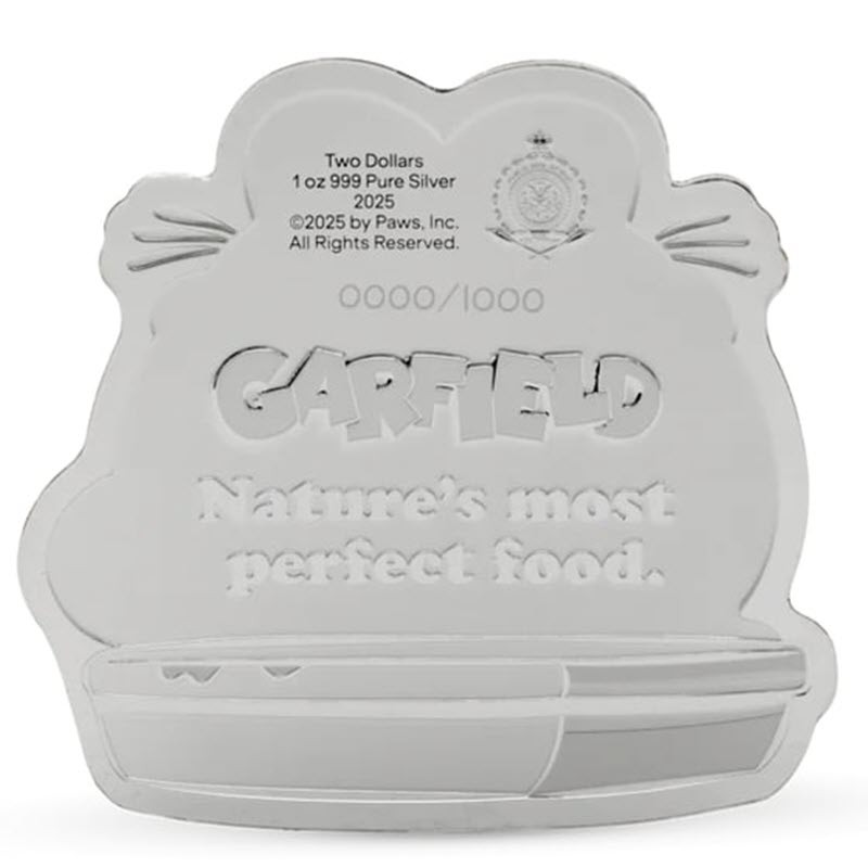 На аверсе вверху слева надпись: Two Dollars 1 oz 999 Pure Silver 2025 ©2025 by Paws, Inc. All Rights Reserved. (номинал, вес и проба серебра, год чеканки, авторские права). Правее изображен герб Ниуэ. Внизу надпись: хххх/1000 GARFIELD Nature's most perfect food. (индивидуальный номер монеты, Гарфилд, Самая совершенная еда, созданная природой).