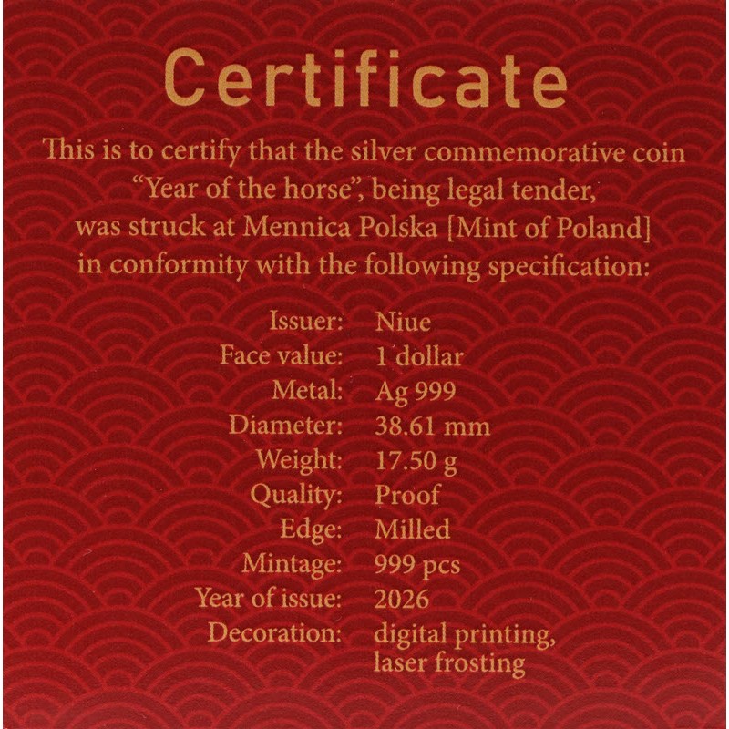 Серебряная монета от польского монетного двора Mint of Poland посвящена символу 2026 года - Лошади. У нее качество пруф и селективная окраска. Поставляется в оригинальном футляре с сертификатом подлинности. Тираж: 700 штук.