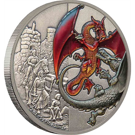 Первая монета серии «Мистические Драконы», выпущенная Монетным двором Новой Зеландии. Красный Дракон является символом победы британцев над саксонцами.