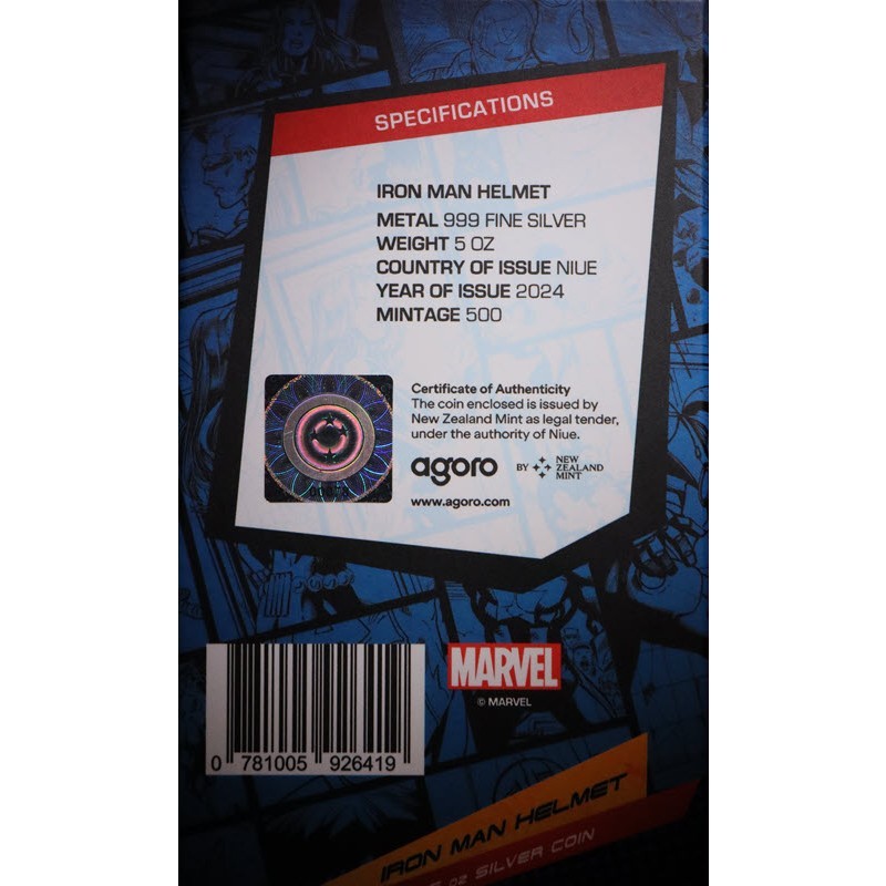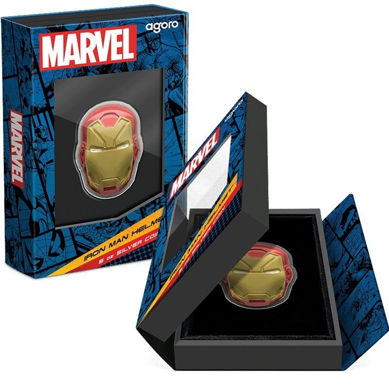 Эта чудесная серебряная монета весом 5 унций посвящена Шлему Железного человека из киновселенной Marvel. У нее размер 65 Х 47,4 мм, качество пруф и селективная окраска. Поставляется в оригинальном футляре с сертификатом подлинности. Тираж 500 штук.