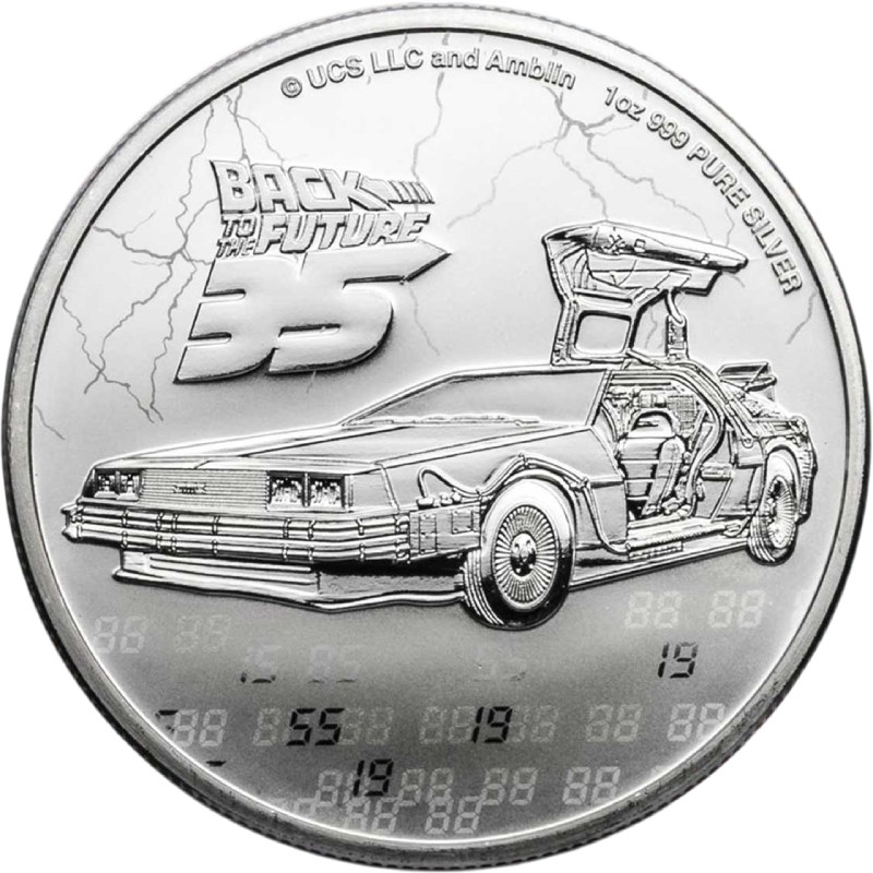 Эта чудесная 1 унцовая серебряная монета посвящена 35 годовщине со дня выхода первого фильма трилогии «Back to the Future» («Назад в будущее») - классике научной фантастики о путешествиях во времени безумного учёного доктора Эмметта «Дока» Брауна и молодого Марти Макфлая.