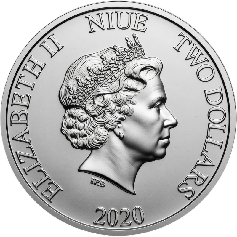 В центре - портрет Ее Величества Королевы Елизаветы II работы дизайнера Яна Рэнка-Бродли. Вдоль канта надписи: ELIZABETH II  NIUE  TWO DOLLARS  2020 (Елизавета II, страна-эмитент, номинал, год чеканки).