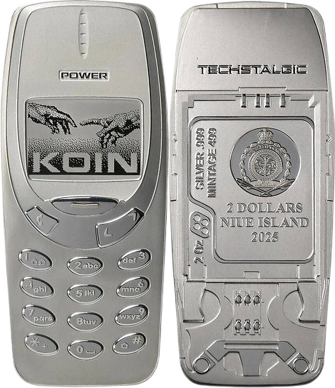 На аверсе обратная сторона телефона изображена без крышки аккумуляторного отсека, открывая печатную плату и компоненты. В верхней части неофициальная «Государственная печать Ниуэ». Над печатью надпись: TECHSTALGIC (серия), слева: 2 Oz SILVER .999 MINTAGE 499 (вес и проба серебра, тираж), внизу: 2 DOLLARS NIUE ISLAND 2025 (номинал, страна-эмитент, год чеканки).