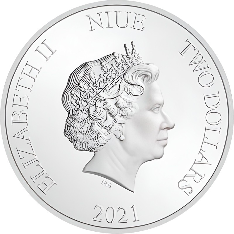 В центре - портрет Ее Величества Королевы Елизаветы II работы дизайнера Яна Рэнка-Бродли. Вдоль канта надписи: ELIZABETH II  NIUE  TWO DOLLARS  2021 (Елизавета II, страна-эмитент, номинал, год чеканки).