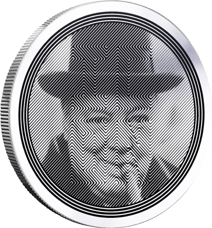 На реверсе изображение текстурированной поверхности, напоминающий эффект муара. Они отображают скрытое изображение сэра Уинстона Черчилля, с наложением слова ICON.