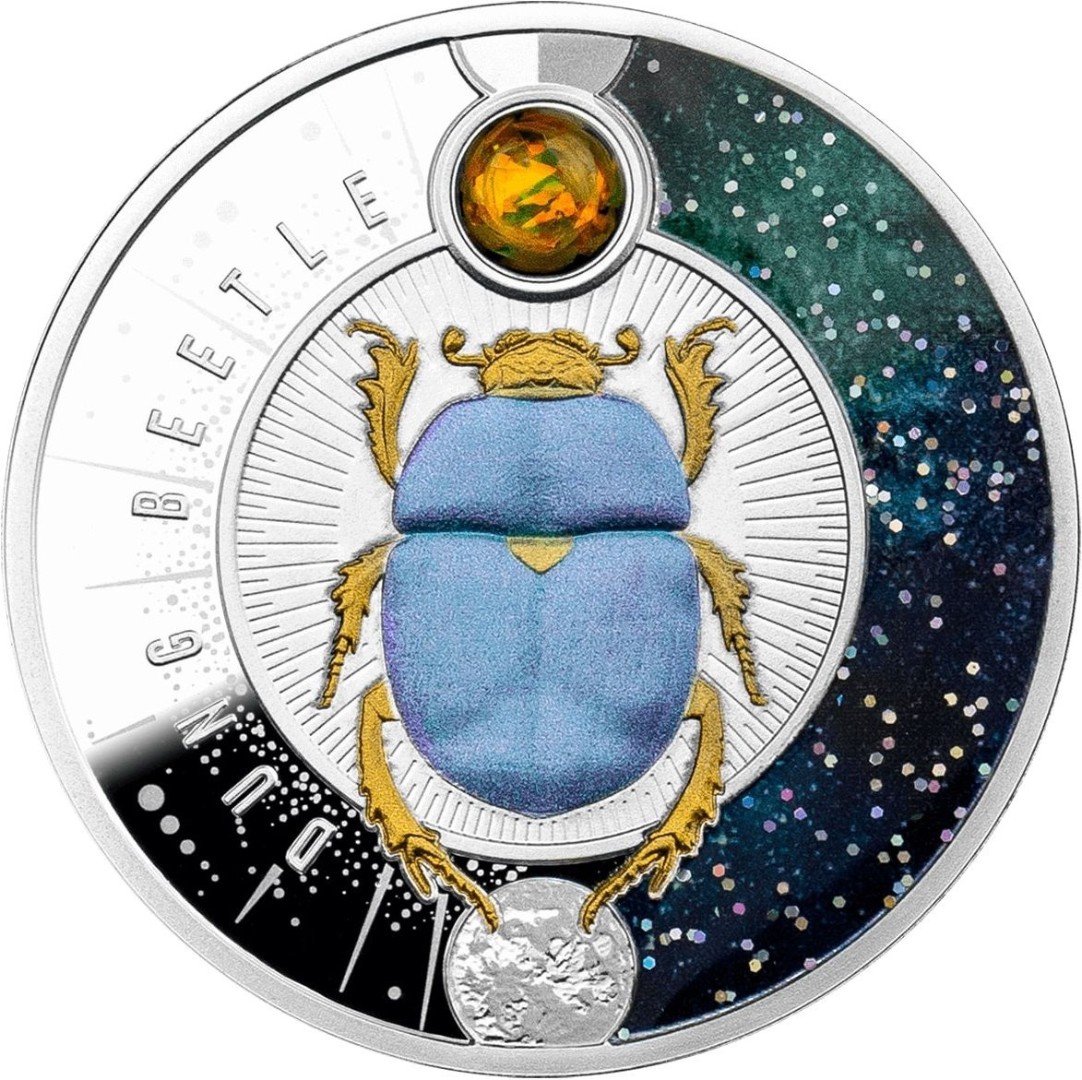 На этой невероятной серебряной монете изображен потрясающий амулет удачи - скарабей (навозный жук). Монета выборочно окрашена, залита смолой с блестками, имеет красивую опаловую вставку и поставляется в футляре вместе с сертификатом подлинности. Ограниченный тираж всего 700 штук по всему миру!