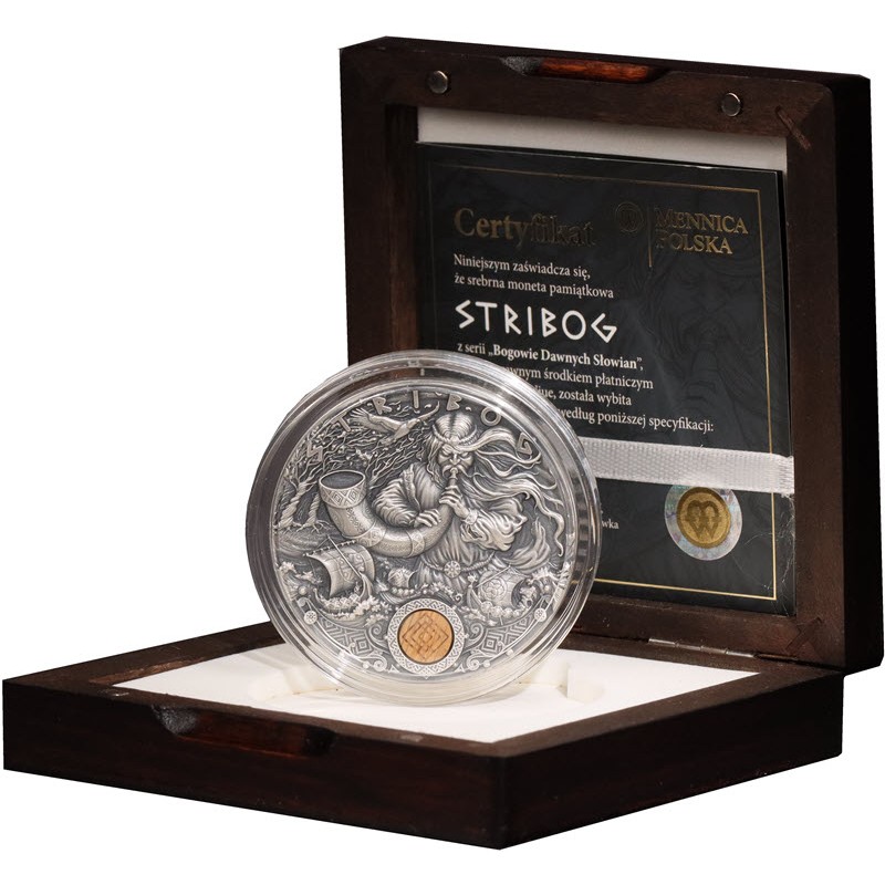 Серебряная монета из серии «Славянские боги», посвященная славянскому богу ветров. Монета изготовлена в античном стиле. Ограниченный тираж.