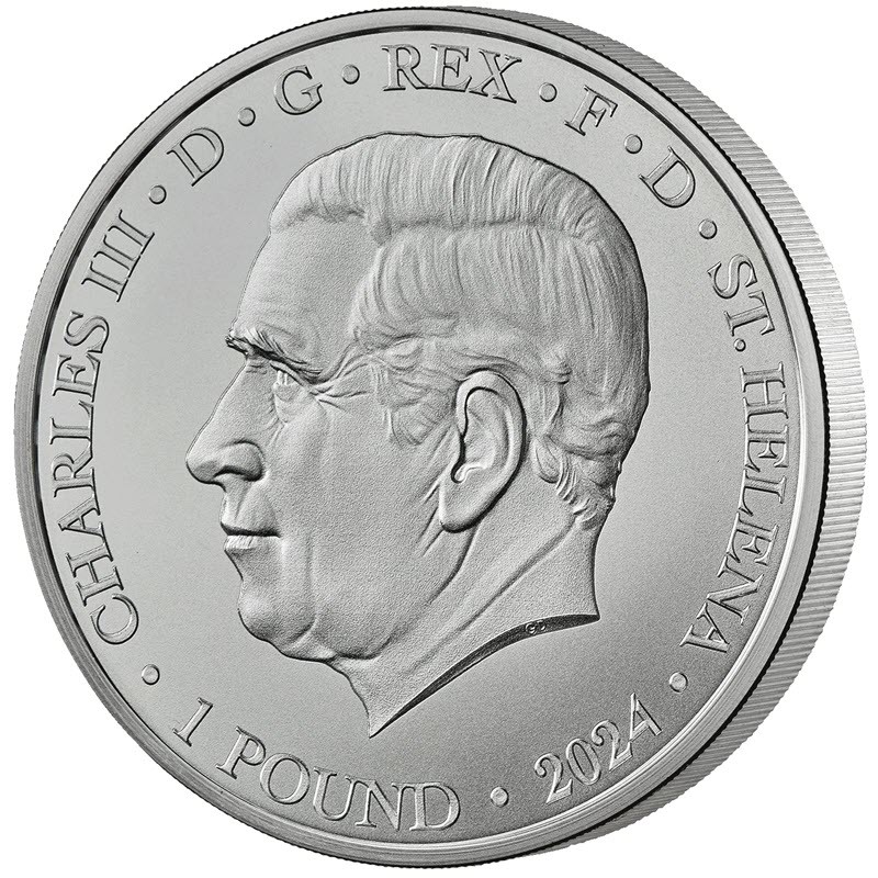 На аверсе портрет Чарльза III работы Глина Дэвиса. На срезе шеи инициалы дизайнера GD (Glyn Davies). Вокруг портрета надпись: CHARLES III · D · G · REX · F · D · ST. HELENA · 1 POUND · 2024 · (Чарльз III, божьей милостью, король, защитник веры, страна-эмитент, номинал, год чеканки).