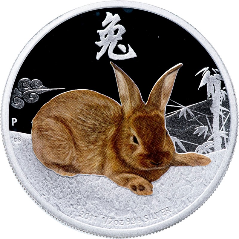 На реверсе – цветное изображение рыжего кролика на фоне стилизованного пейзажа с бамбуком и облаками. Вверху расположен китайский иероглиф «兔» (Кролик). Внизу надписи - 2011 1/2 oz 999 Silver (год чеканки, вес и проба серебра). Слева – монограмма монетного двора - P (Пертский монетный двор, Австралия) и инициалы дизайнера реверса - DB (Darryl Bellotti, Дэррил Беллотти).